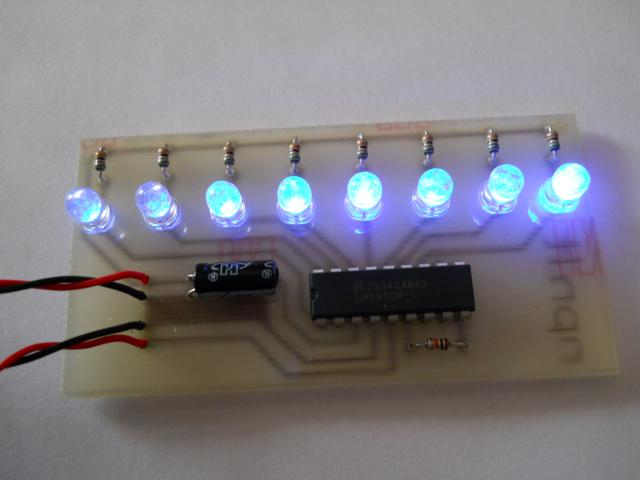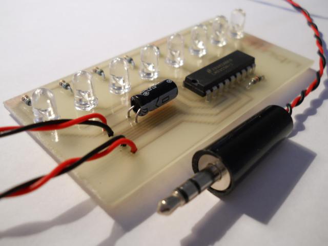VU meter'is indikuojantis garso lygį. Diodai mirgsi pagal muziką :)