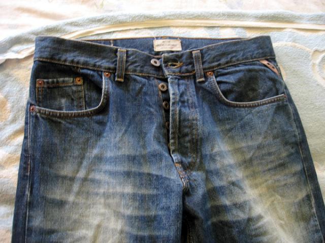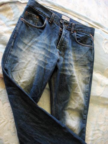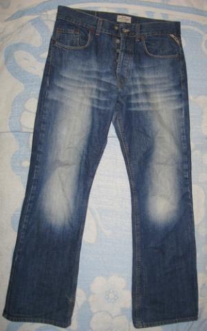 S/M. Užsagstomi sagom, tiesaus kirpimo džinsai. Išmatavimai: visas ilgis - 105cm, nuo klyno - 82cm. liemens apimtis(nuo sagos iki tos pačios sagos) - 86cm. nugaros pusės aukštis - 37cm, priekio - 29cm. šlaunies apimtis plačiausioje vietoje ~65cm.