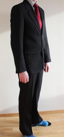 Labai geros būklės vyriškas kostiumas. Dėvėtas porą kartų, be defektų. Sudėtis: 65% vilna, 35% viskozė. Ūgis 182 cm, krūtinės apimtis 88 cm, liemens apimtis 76 cm. Medžiagos kokybė gera, nesilamdo.