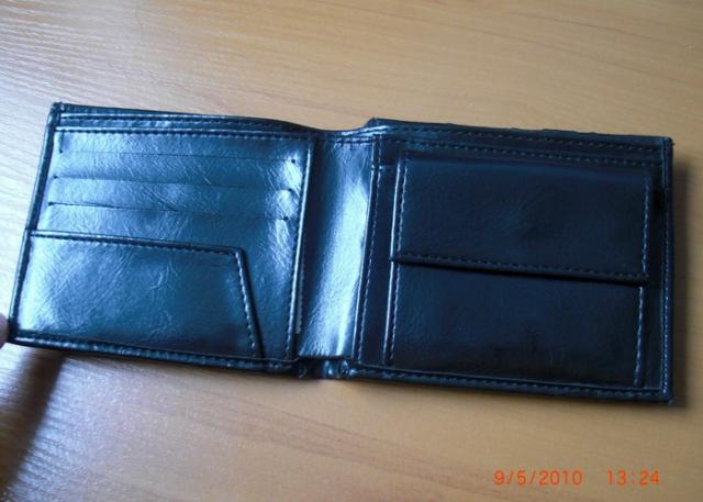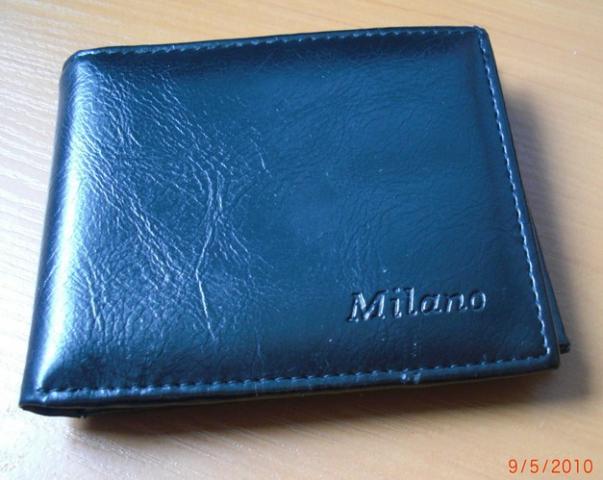 Juoda paprasta pinigine, neodine. Ant priekio uzrasas Milano. bet seip labai faina ir talpi :) be defektu.