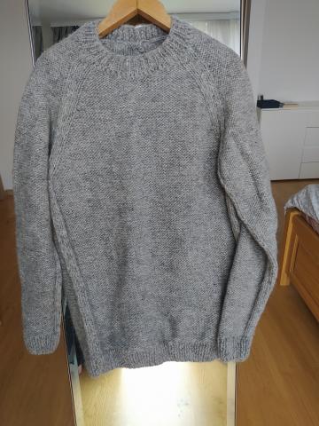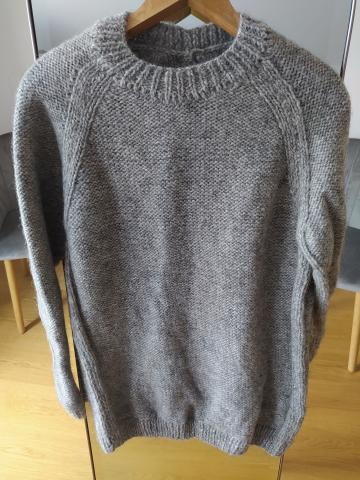 Megztas rankų darbo storų vilnos siūlų (100%) žieminis vyriškas megztinis. Dydis turėtų atitikti L/XL. Rankovės ilgis 64 cm, megztinio ilgis 76 cm, ištemptos apykaklės skersmuo 26 cm, krūtinė apie 104 cm ir dar laisvai tamposi. Užsidėta tik porą kartų.