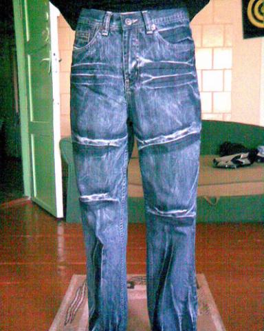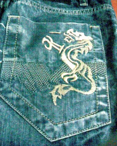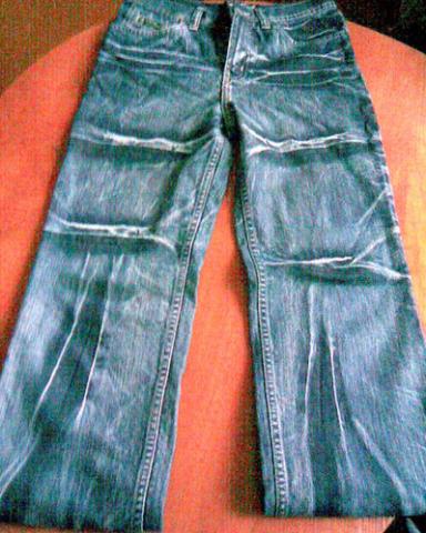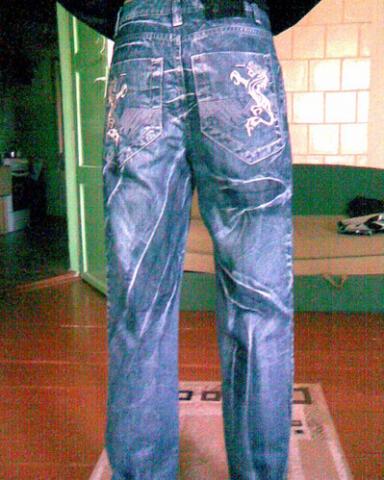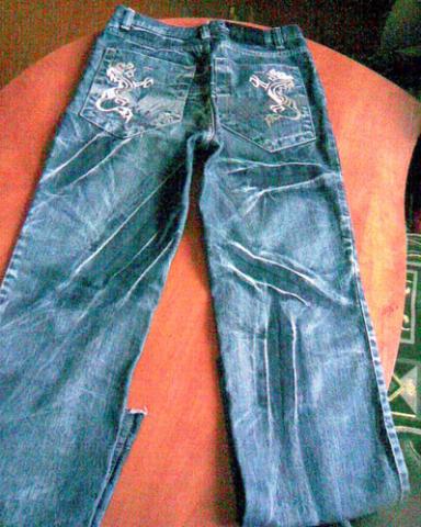 Tamsiai mėlynos spalvos, su įvairiais išgarintais raštais, siuvinėtomis kišenėmis, tiesaus kirpimo.