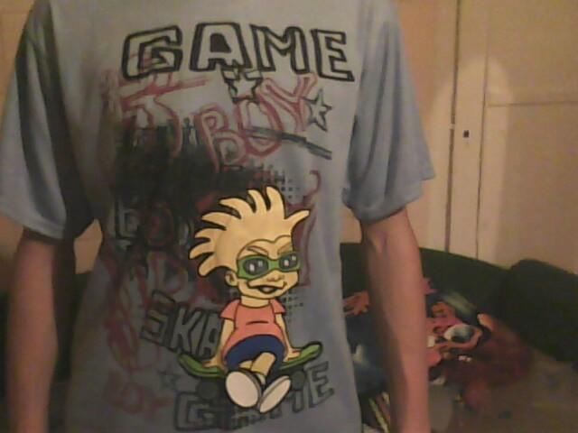 152 cm ūgiui, melsvi marškinėliai su užrašais ir paveikslėliu.