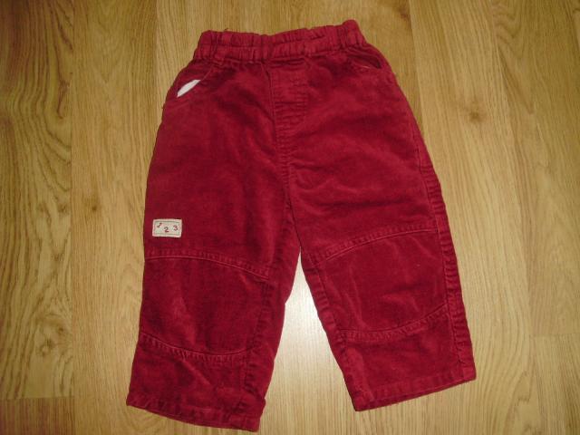 Vyšnios spalvos velvetinės kelnės su kišenėmis, yra kilpelės diržui. Tinka 9-12 mėn. kūdikiui. Kelnių ilgis - 40 cm.