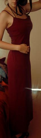 Vyšninės spalvos maxi suknelė su skeltuku šone