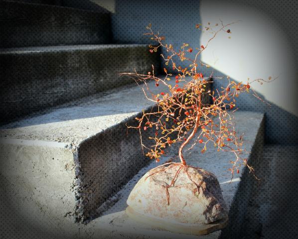 Pintas medis is vielos,jaspio skaldos ir cekisko biseriuko apdaila. Lauko akmuo ir medinis pagrindas.