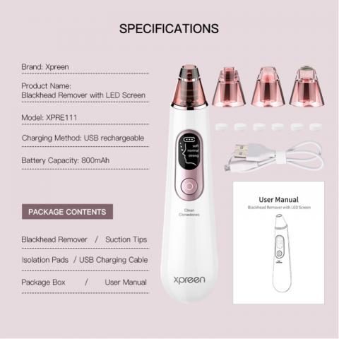 XPREEN veido porų valiklis su LED ekranu + DOVANA (metaliniai 5 valymo įrankiai) + daug antgalių Veido porų valikliai pašalina riebalų perteklių, nešvarumus ir negyvas odos ląsteles, kurios gali užkimšti poras. Tai padeda išvengti spuogų ir inkštirų susidarymo. Pašalinus nešvarumus ir riebalus, oda gali laisviau kvėpuoti. Tai svarbu jos sveikatai ir atsinaujinimui. XPREEN veido porų valiklis su LED ekranu. Išvalo net ir giliausias poras, šalina spuogus, aknę. Stiprus siurbimo efektas, kuris yra nekenksmi