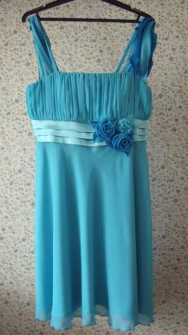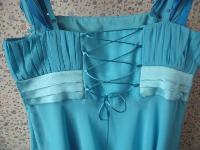 Suknelės išmatavimai: plotis po krūtine 45cm (raištelių pagalba susitraukia iki 38 cm); ilgis nuo pečių 98 cm. Suknelė aukščiau kelių. Galima nuimti arba koreguoti petnešėles. Jeigu reikia prie suknelės yra priderintas Esprit megztinukas 3/4 rankovėmis XL dydžio (+15Lt) ir Baltman vyriškas kaklaraištis (+30Lt).