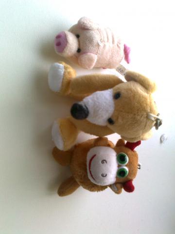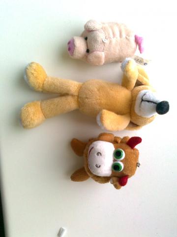 Kiaulytė, šuniukas (segasi prie tašės) ir karvutė