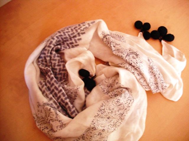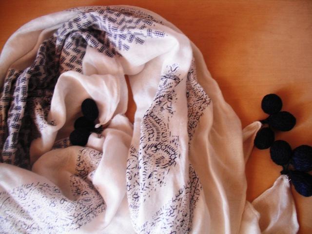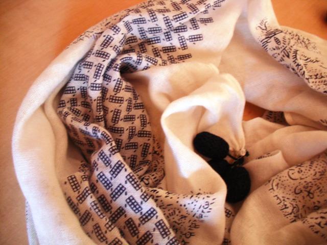 Visiškai nauja skara, jokių defektų, nė karto nepanaudojau, niekur nepriderinau. Balta su tamsiai mėlynais raštais, o ant kiekvieno skaros kampo tamsiai mėlyni bumbuliukai. Labai įdomi ir išskirtinė.
