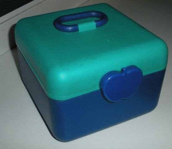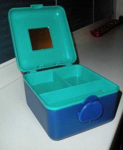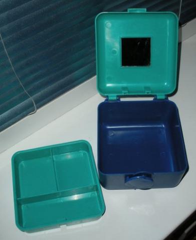 iš dviejų skyrių, gan talpi. Ismatavimai: 13X13cm, aukstis 10cm