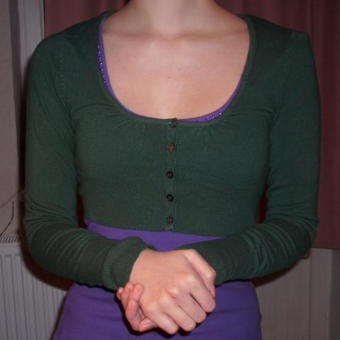 Tamsiai zalios spalvos trumpas megztukas su sagutemis. Uzisedetas viena karta, todel yra visiskai naujas.