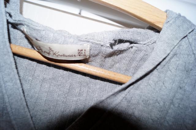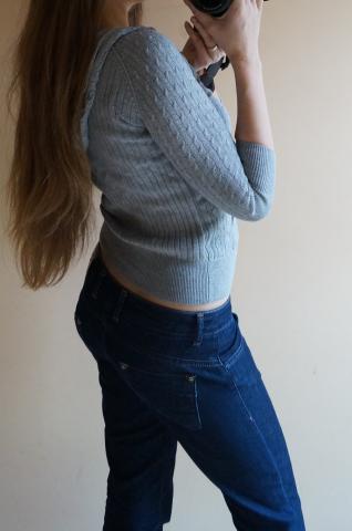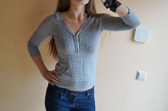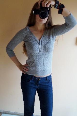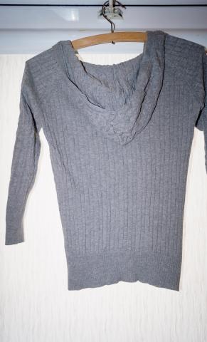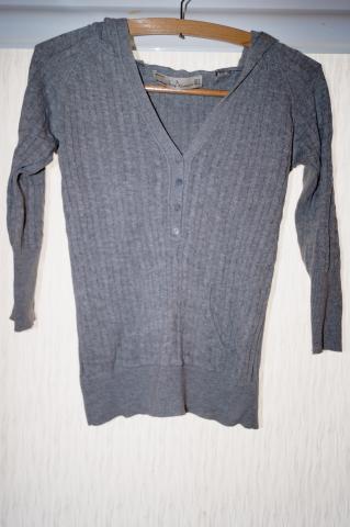 Medvilninis pilkas megstukas Zara su kapišonu, pusilgėmis rankovėmis, V iškirpte. Sagutės nėra tik imitacija, jos sagstosi. Ant pilvo yra kišenė. Tiks XS, S dydžiams. Yra defektas - iširusi 2 vietose siūlė, prijungianti kapišoną. Nesunku susitvarkyti. Pati nešiojau taip, kapišonas užsidėjus paslepia iširimą, jo nesimato. Neskaitant to, būklė dar labai gera. Ilgis 54 cm.