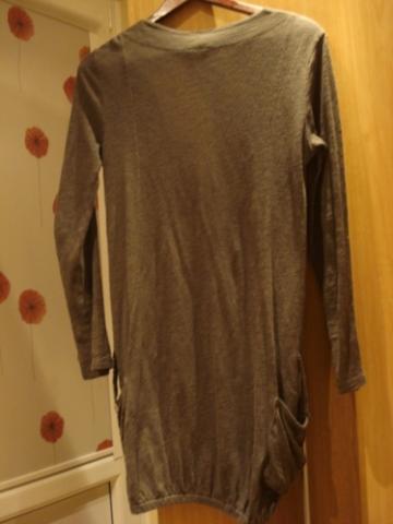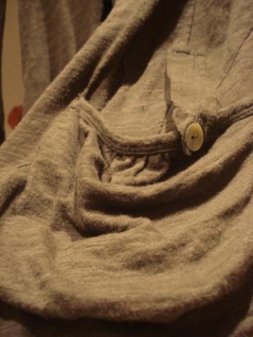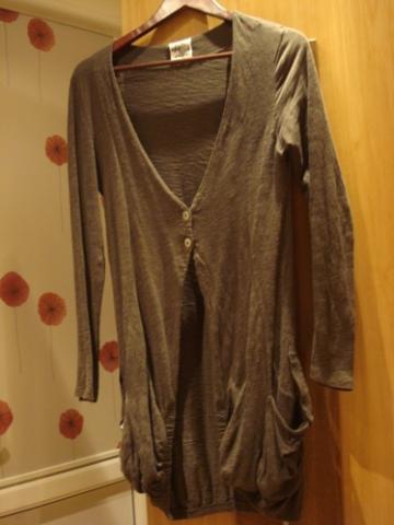 idomaus kirpimo, užsegamas dviem perlamutrinėmis sagomis. apačia sutraukta, su giliomis kišenėmis, kurios taip pat prisegtos tokiomis pat sagomis. žalios chaki spalvos