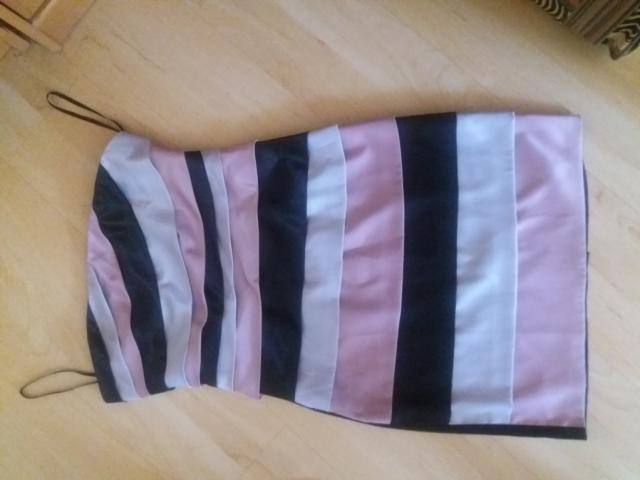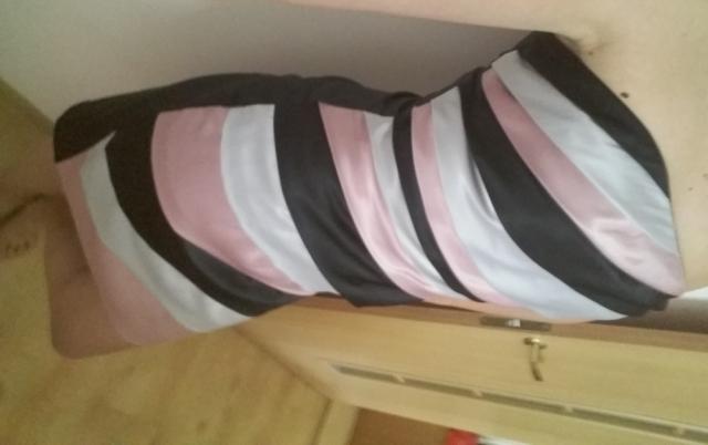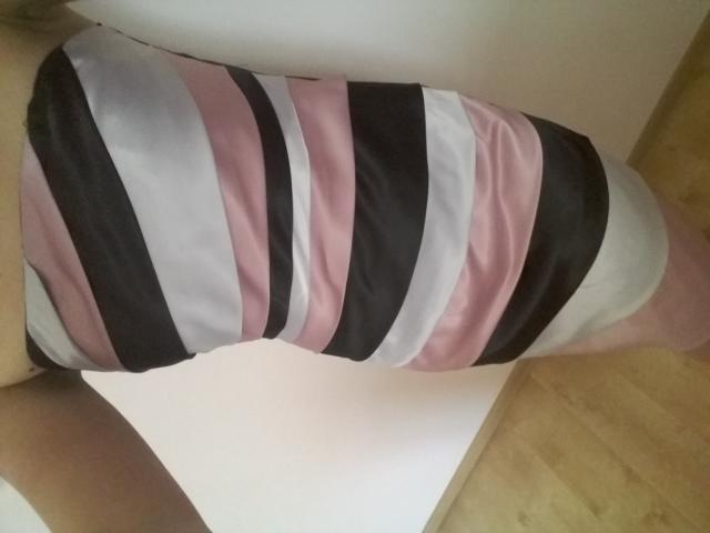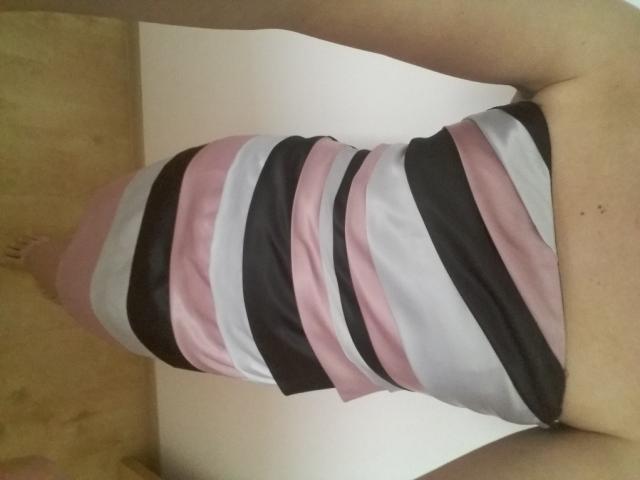 labai žavi progine suknele, prieky spalvota, o nugaroje juoda. be sleikuciu. Sluoksniai priekyje paslepia trukumus :)