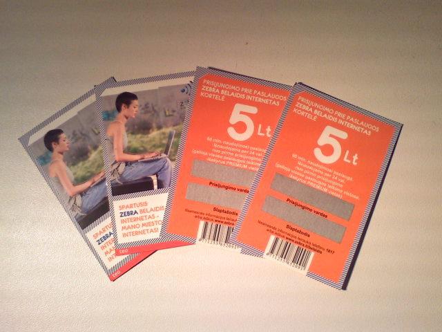 4 kortelės, kurių vienos vertė 5 lt. Nenaudotos galiojančios. 1 kortelė suteikia galimybę prisijungti prie ZEBRA interneto 1 valandai.