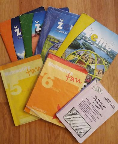 Geografijos atlasai Zeme nuo 6 iki 9 kl. Matematika tau 5 ir 6kl. Matematikos uzdavinynas 7kl.