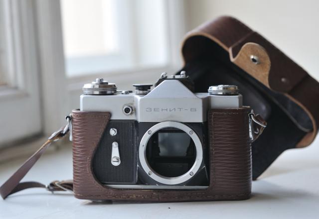 Zenit-B (Zenit-V) pilnai veikiantis fotoaparatas su "odiniu" dėklu. Galiu sukomplektuoti su pasirinktu objketyvu.
