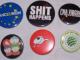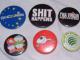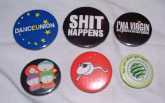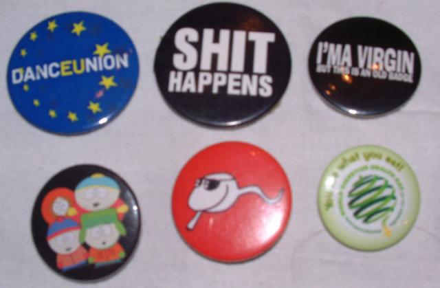 1- danceunion 2- shit happens 3- i'm a virgin. but this is an old badge 4- pietų parko veikėjai 5- spermiukas 6- you are what you eat galiu ženkliukus pridėti prie mainų ((: foto prastos kokybės, bet šiaip ženkliukų būklė gera