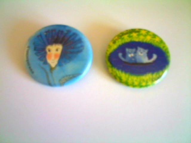 2 zenkliukai is nieko rimto. Ant melyno parasyta: www.niekorimto.lt , o ant kito :du katineiai valtyje.