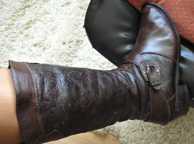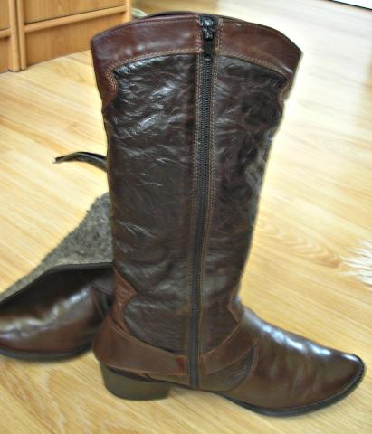 Zieminiai,silti,kaubojisko tipo ilgaauliai batai. Deveti labai mazai, gryna kaina buvo 350lt, kadangi jie nebe nauji,atdiuosiu pigiau. Pati oda tarsi rauksleta,per kulksni eina sagtis,spalva tamsiais ruda su siektiek sviesesne ruda. priekis vos vos smailejantis