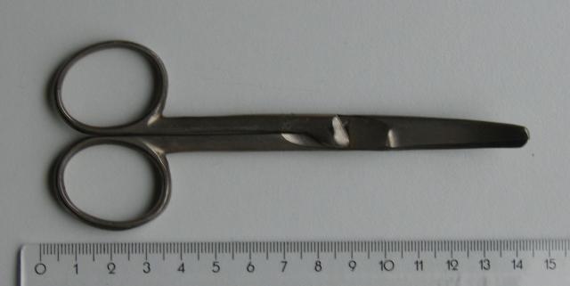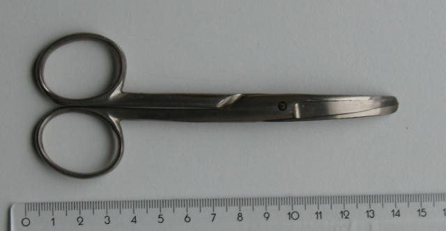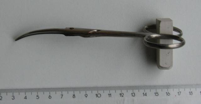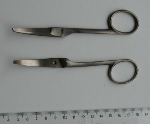 Tarybinių laikų nerūdijančio medicininio plieno medicininės žirklės lenktomis geležtėmis. Naudotos. Pasidalina į dvi dalis ir susideda.