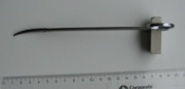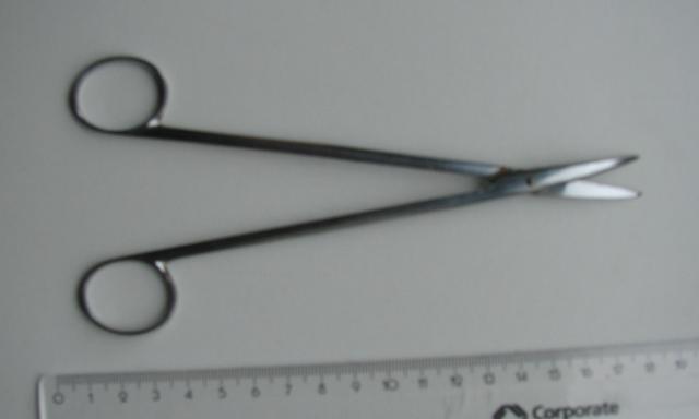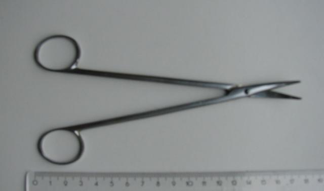 Tarybinių laikų nerūdijančio medicininio plieno chirurginės žirklės lenktomis geležtėmis. Naudotos.