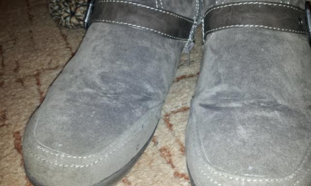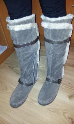 Spalva ne pilka o chaki. Nedaug nešioti, labai šilti. Visas bato vidus vien kailis. Išorė zomšas. Defektas - nuo keletos kartų ėjimo bato nosis pasilanksčiusi.