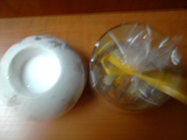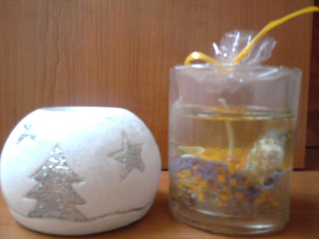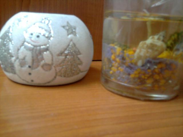 Žvakidė balta su sidabrinėm snaigėm,eglute ir sniego seniu. Žvakė su permatomu vašku, viduje graži kompozicija su kriauklytėm ir visokiais spalvotais akmenėliais ir pan :)