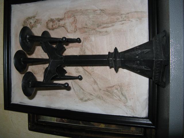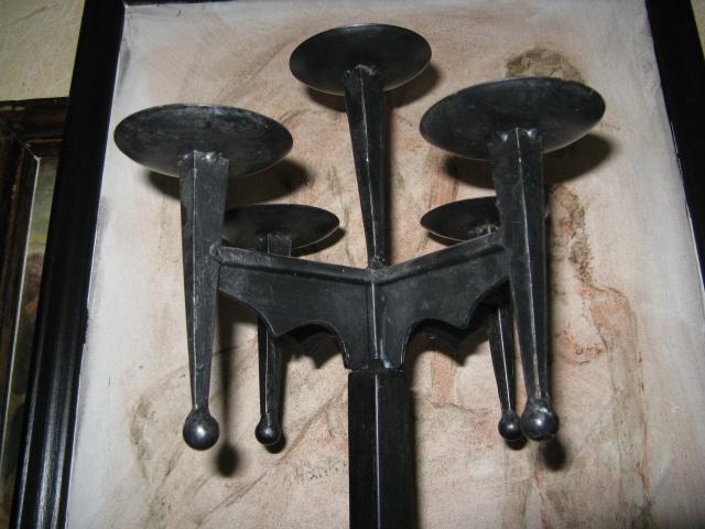 kalvio darbo metalinė žvakidė, aukštis: 44 cm., plotis: 25 cm., svoris: 1320 g.