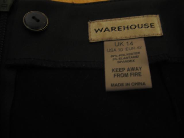 warehouse etiketė, užrašytas 42 dydis, nors man labiau 40 primena. nors galėsiu išmatuoti, kad neliktų abejonių ar jums tinka ar ne. viduje užsisegus užtrauktuku dar yra sagutė. yra skeltukas, skeltukas 1cm padidėjęs, nes siūlė 1cm atirus......