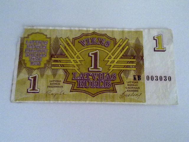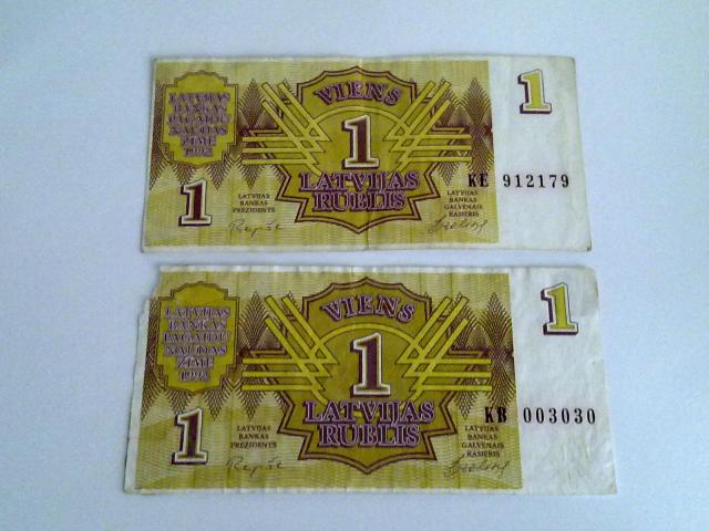 1992 m. Latvijos 1 rublis. Banknotai iš apyvartos, 2 vnt. Vienas banknotas apgadintas.