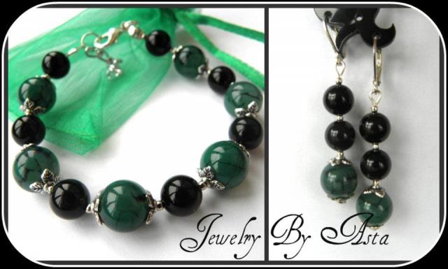 Agatas ir oniksas. Apyranke 18.5 cm ilgio (+ 2 cm prailginimo grandinele), auskarai 5.4 cm ilgio. Agatukai 1 cm, oniksai 0.8 cm skersmens.