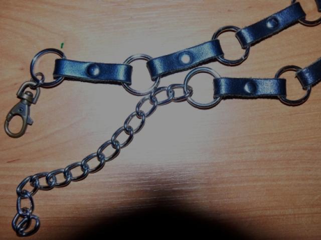Dydis bet koks, nes užsegti galima ties bet kuriuo žiedu. Odinis, tvirtas.