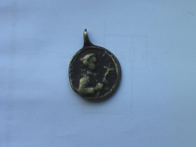 Senovinis, kaip spėjama rankų darbo pakabukas. Neaiškaus metalo. Gana senas. Rastas Lietuvoje.
