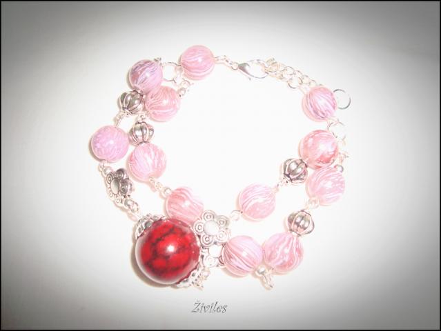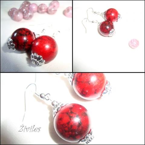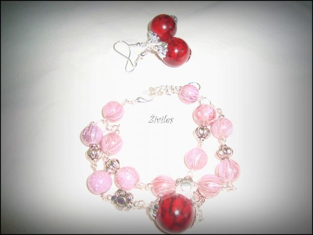 Rankų darbo papuošalai, rausvos spalvos su metalinėmis detalėmis.