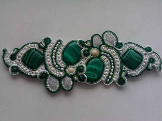 Rankų darbo apyrankė iš sutažo juostelės, akmenų ir karoliukų