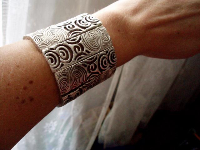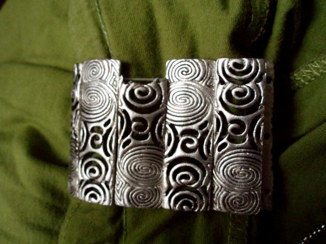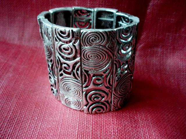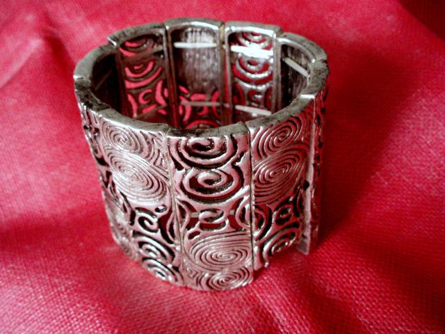 Tikrai laaaaaabai graži ir patogi apyrankė iš metalinių detalių suvertų ant gumyčių. Atrodo kaip prabangi sidabrinė indiško stiliaus apyrankė, bet yra bižuterinė. Viena detalė nulūžo (matosi antroje nuotraukoje); nešioti galima, bet....