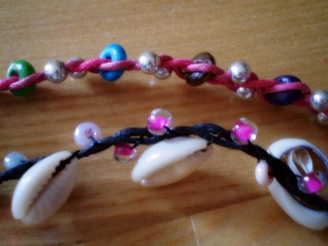 Suvertos ant siūlų, rožinė ir juoda. Iš medinių karoliukų, kriauklių.