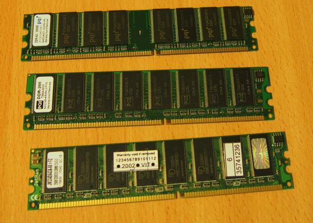Atmintis RAM DDR staliniams kompiuteriams. Visos po 256MB. Samsung 256MB DDR266 PC2100 - 2 vnt. PQI 256MB DDR266 PC2100 - 1 vnt. JetRam 256MB DDR333 PC2700 CL2.5 - 1 vnt. Samsung 256MB DDR333 PC2700 - 1 vnt. Tice 256MB DDR333 PC2700 - 1 vnt. PQI 256MB DDR400 PC3200 - 1 vnt. Infineon 256MB DDR400 PC3200 CL3 - 3 vnt.
