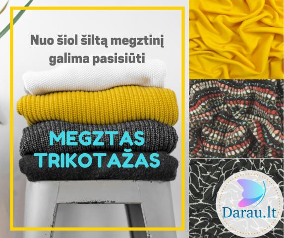 Įvairūs audiniai ir medžiagos drabužiams ir kitiems siuviniams internetinėje audinių parduotuvėje www.darau.lt: aksomas, veliūras, soft veliūras, flisas, žvynelių audinys, lininis audinys, neperšampamas audinys, šifonas, plonas, storas trikotažas, neoprenas, likra, jersey, merino vilnos trikotažas, kilpinis trikotažas, rib trikotažas, megztas trikotažas, įvairūs vilnoniai audiniai, atlasas, gabardinas, dirbtinis kailis, medvilniniai, viskoziniai audiniai, paltiniai striukiniai audiniai, audiniai suknelėms,