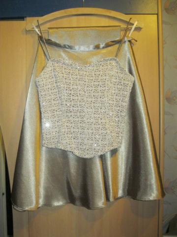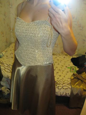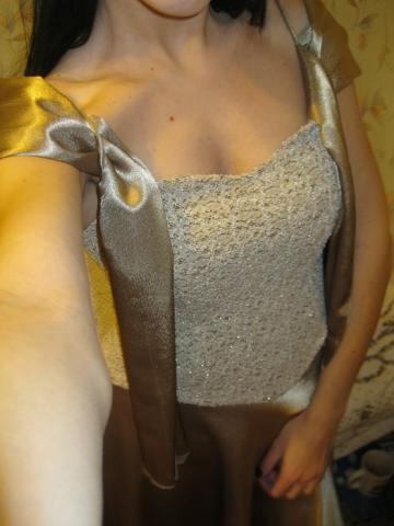 Progine auksines spalvos suknele.Virsus neriniuotas blizgus,gale uzsitraukia uztrauktuku,sijonas atlasinis,po apacia yra pamusalas. Dar yra skraiste, ja galima uzsideti ivairiai,kaip fantazija leidzia.Dydis S/M mažiau