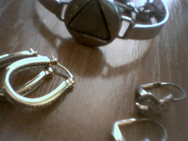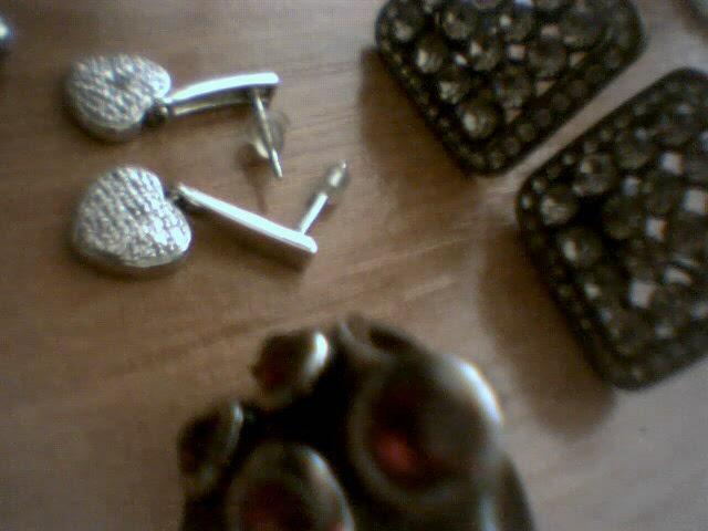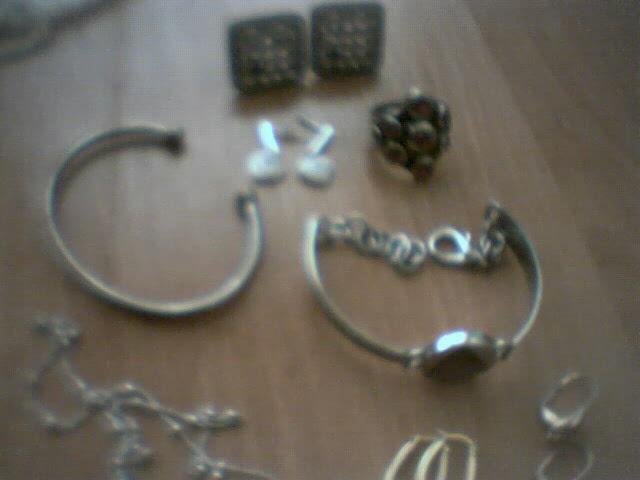 klipsai(kvadratiniai), sidabriniai auskariukai (sirdeles formos) , ziedas su raudonom akutem, dvi apyrankes (viena uzmaunama,kita uzsegama), sutrukusi sidabrine grandinele su perlu, ir dvejos poros auksiniu auskariuku(vieni is ju paauksoti)