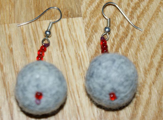 pilki auskarai su raudonais karoliukais.