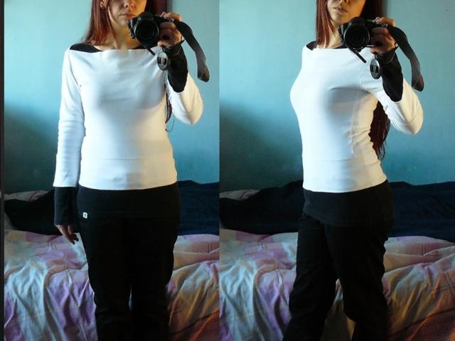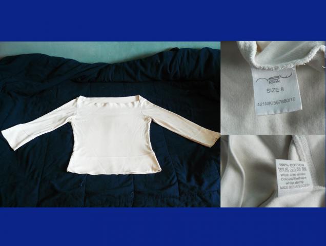 Per ilgai guli spintoj nenešiojama, gal kam bus naudingesnė, nei man :) balta palaidinė, kaklas laivelio formos, rankovės 3/4. Dydis 8. 100% medvilnė.Tie juodi rankogaliai, tai ten kita palaidinė :) nepriklauso šiai. turi kelis geltonus taškelius, gal kada nufotografuosiu :)