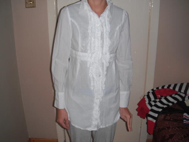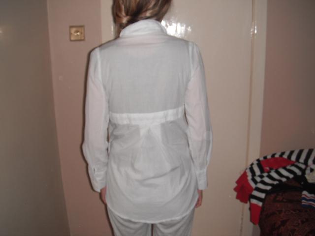 bukle labai gera,tik pora kartu uzsivilkti.ilgis 70cm,krutines plotis 40cm,rankoviu ilgis 59cm,prieki is ilgio triis juostomis is abieju pusiu rauktinukai mazi.