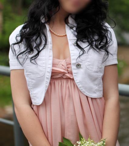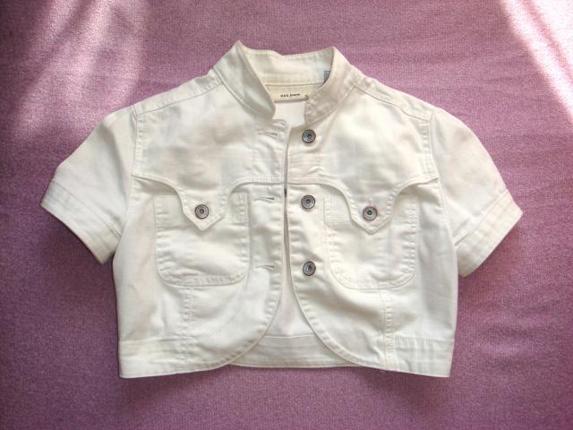 Trumpas baltas švarkelis, bolero kitaip. Spalva sodri balta, kaip pirmoje nuotraukoje. Manau, tiktų ir truputį didesniam S dydžiui :)