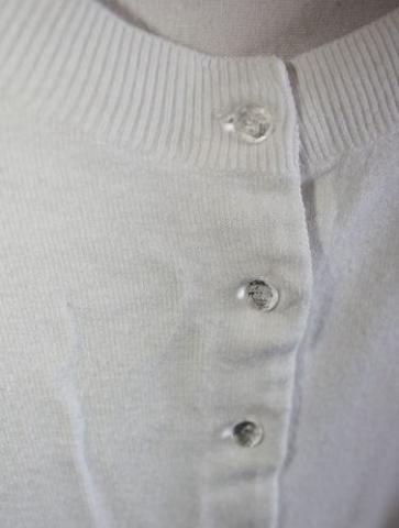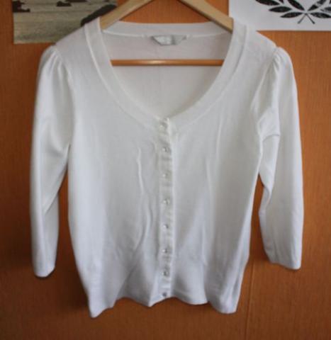 Baltas užsagstomas megztukas su gražiomis sagutėmis ir akykakle. Rankovės žemiau alkūnių. Dydis m-l.