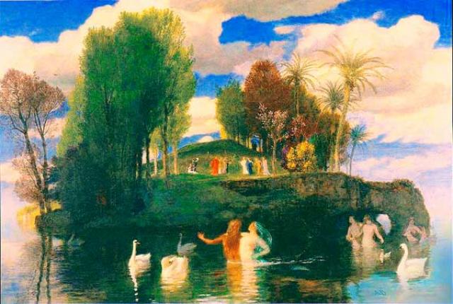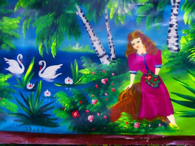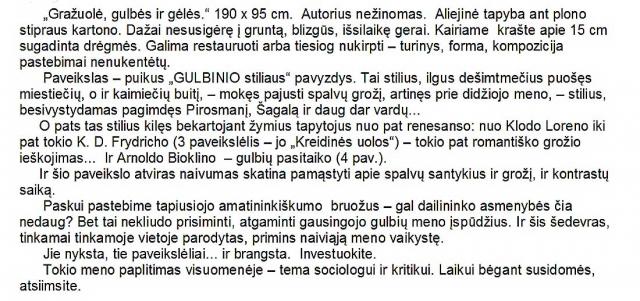 „Gražuolė, gulbės ir gėlės.“ 190 x 95 cm. Autorius nežinomas. Aliejinė tapyba ant plono stipraus kartono. Dažai nesusigėrę į gruntą, blizgūs, išsilaikę gerai. Kairiame krašte apie 15 cm sugadinta drėgmės. Galima restauruoti arba tiesiog nukirpti – turinys, forma, kompozicija pastebimai nenukentėtų. Paveikslas – puikus „GULBINIO stiliaus“ pavyzdys. Tai stilius, ilgus dešimtmečius puošęs miestiečių, o ir kaimiečių buitį, – mokęs pajusti spalvų grožį, artinęs prie didžiojo meno, – žr. 5 pav. ...