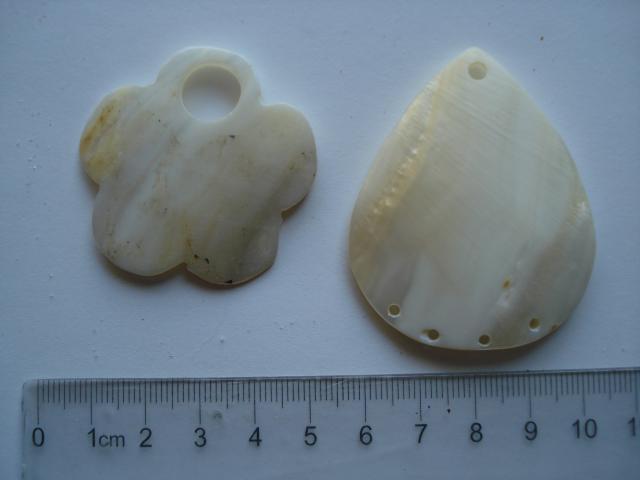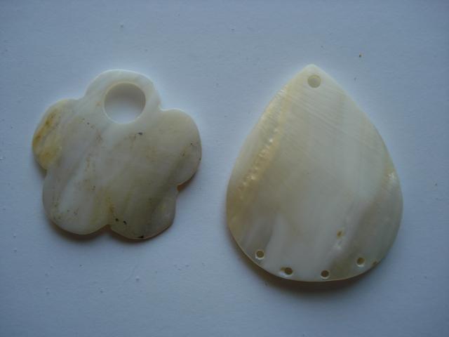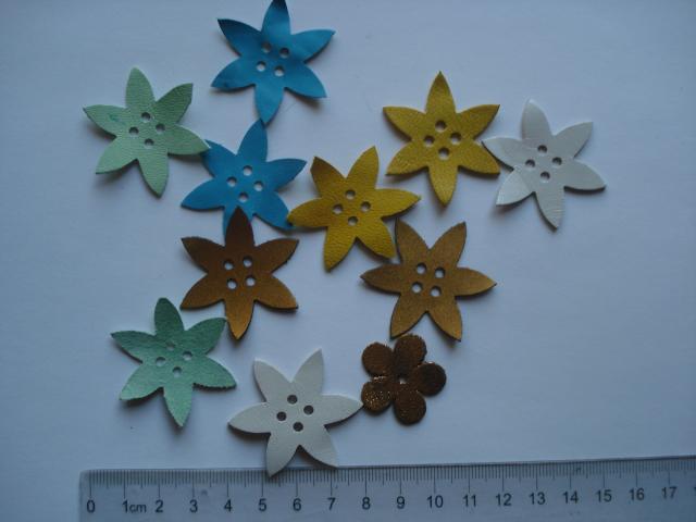 1,2 foto kriauklės, 3 odelė ir medinis karoliukas, 4 foto odinės gėlytės su skylutėmis.